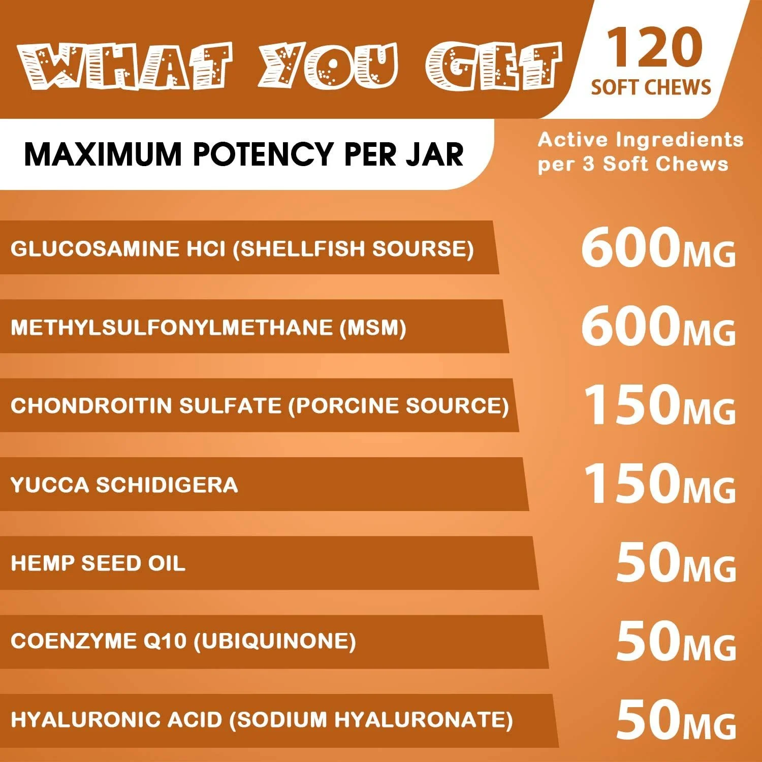 - Powerful Blend of Ingredients Known to Support Dog Joint Health, Mobility, and May Help Discomfort Associated With Normal Daily Activity - Supporting your dog's joint health is important, our soft dog treats make that easy; Every soft chew is loaded with Glucosamine HCl, Chondroitin, MSM, Yucca Schidigera, CoQ10 (coenzyme q10), and Hyaluronic Acid (HA); Plus Salmon Oil & Cod Liver Oil for skin and coat health.