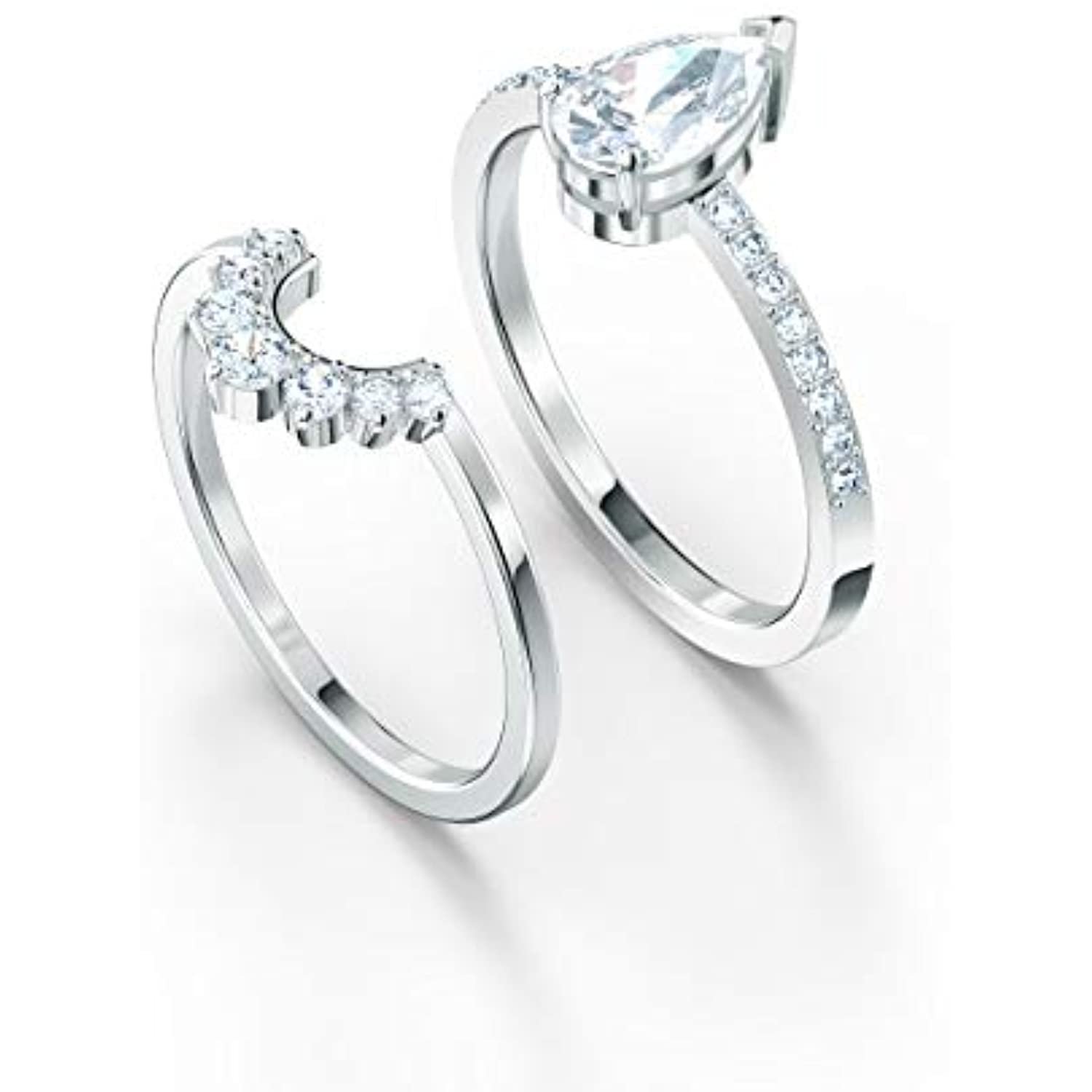 - Items delivered: 1 x Swarovski Attract pear ring set, size 50, with 2 x rhodium plated bands, featuring a drop-shaped stone centrepiece and crown-shaped sparkling crystal pavé, with Swarovski ring box