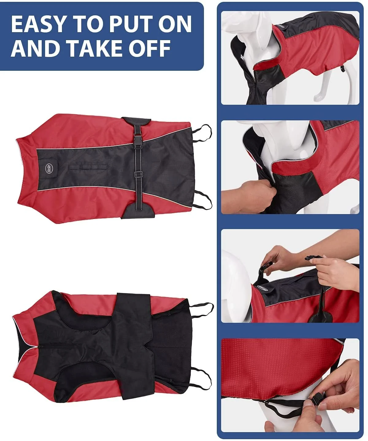 - Easy to wear and take off.Adjustable BUCKLE at belly and zipper at neck,so you can easily get your dog dressed and they won't have any uncomfortable feeling;Two Cord Ring at hemlines setting into the hind legs of your pet in order to fixed,so the dog coat won't shift in general.