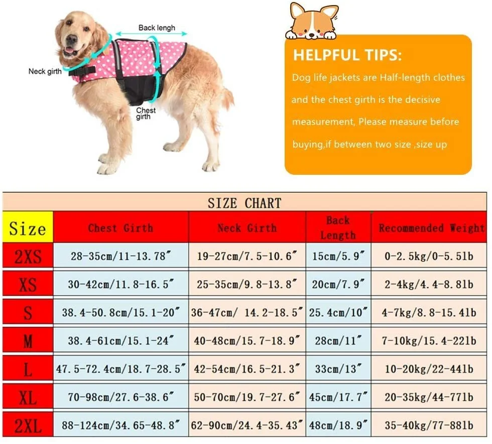 - 【SIZE CHOOSE & NOTICE】 Life jackets are half-length suits and chest girth is the decisive measurement, Please taking every measurement listed on the chart before choose your size. If your measurement is between two sizes, we recommend the larger size for more comfortable fit about your dog.
