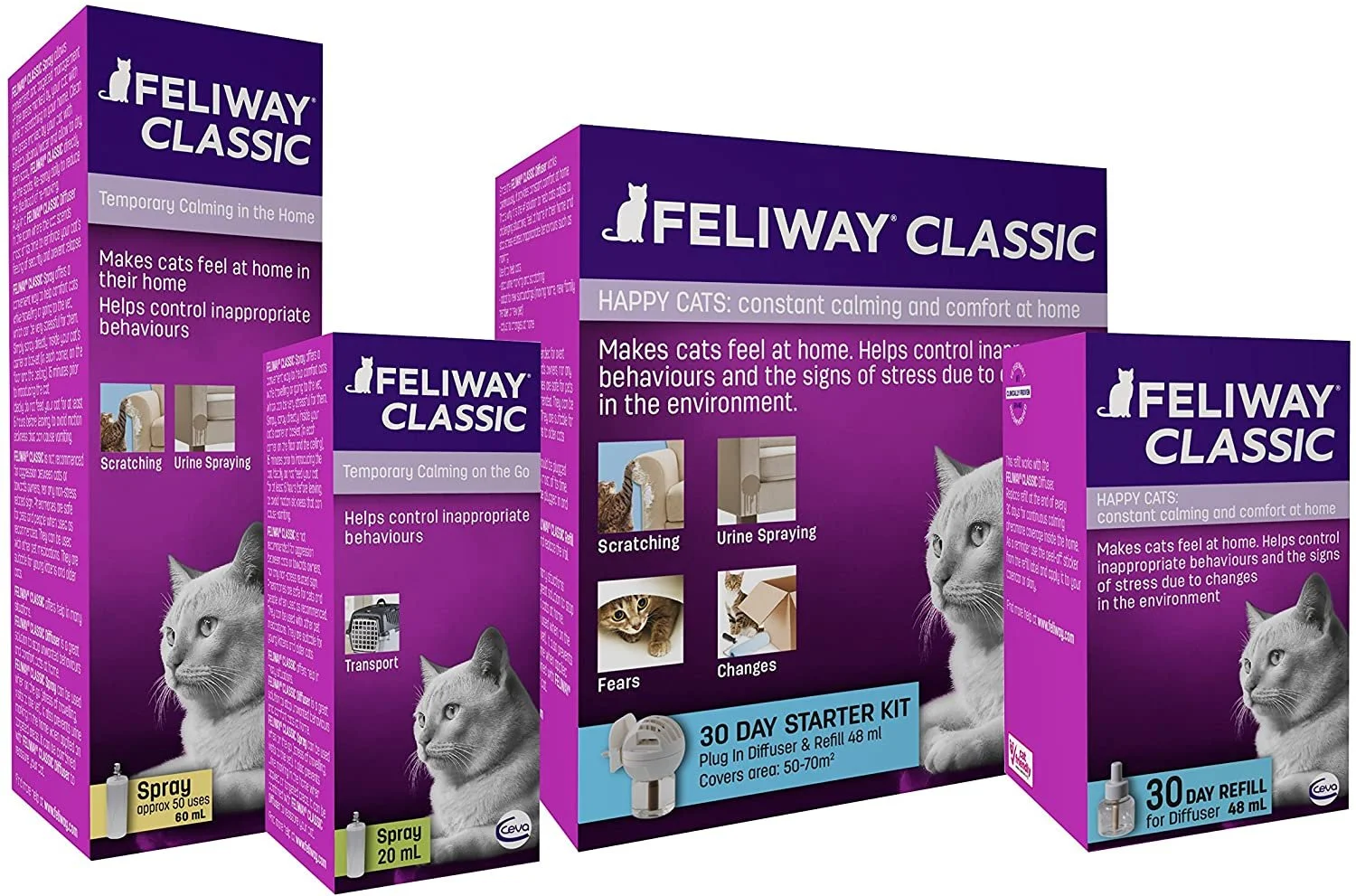 FELIWAY Classic 30 day Refill x3 Value Pack. FELIWAY Classic comforts cats, helps solve behavioural issues and stress/anxiety in the home - 48ml x3 £102.90 The No1 clinically proven cat behaviorual product. Backed by over 25 years of science & research into pet welfareContains the 'feline facial' pheromone. A natural pheromone a cat releases when they rub up against something to mark an area as safe and secure.SCENTLESS and Species specific - no effect on humans or other petsScientifically proven, studies to support all claimsTrusted - used by vets, charities and behaviourists›See more product details Shop › FELIWAY Classic 30 day Refill x3 Value Pack. FELIWAY Classic comforts cats, helps solve behavioural issues and stress/anxiety in the home - 48ml x3 Purchase Added! The No1 clinically proven cat behaviorual product. Backed by over 25 years of science & research into pet welfareContains the 'feline facial' pheromone. A natural pheromone a cat releases when they rub up against something to mark an area as safe and secure.SCENTLESS and Species specific - no effect on humans or other petsScientifically proven, studies to support all claimsTrusted - used by vets, charities and behaviourists›See more product details Reviews Reviewer Name Review Date Star Rating Description Posted on Etsy Product Show More You Might Also Like Beaphar Calming Cat Treats, 35 g £14.66 Feliway Optimum Refill - 48ml £88.20 Feliway Classic environment spray 60 ml £102.90 Ceva Feliway Diffuser Refill 48ml £102.90 Beaphar Calming Spot-On for Cats £17.00