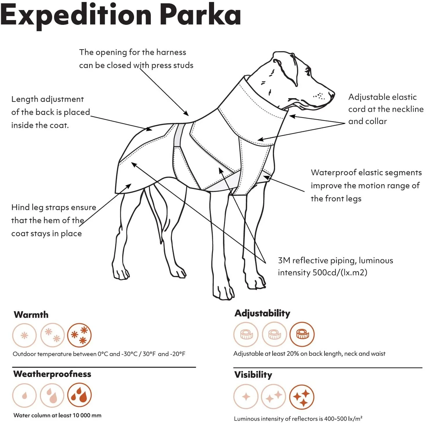 - The Expedition Parka is designed to allow greater freedom of movement and does not restrict movement when the dog is running and playing.