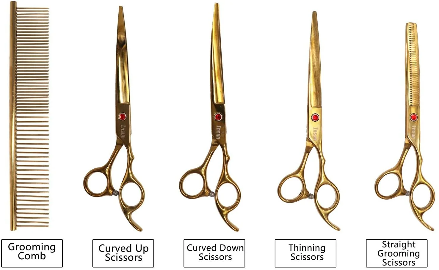 - Straight scissor is for cutting hair,mainly used for pet hair flat parts. Thinning scissor is used to thinning hair,let the hair after pruning more natural and beautiful. The two curved scissors are designed for your pets’ eyelashes, nose, face, ears, belly, hips, etc. Curved scissors is also an essential tool for beauty modeling.