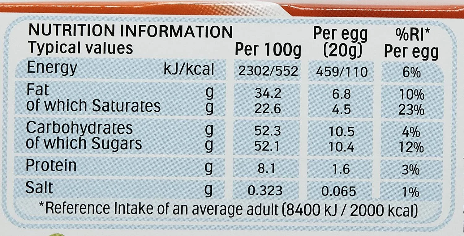 | Ingredients | Sugar, vegetable oil and fat, skimmed milk powder (13%), hazelnuts (12.5%), wheat flour, whole milk powder (7.5%), whey powder, emulsifier: lecithins (soya), milk proteins, raising agents (sodium hydrogen carbonate, ammonium carbonate), salt, vanillin, fat-reduced cocoa.See more |