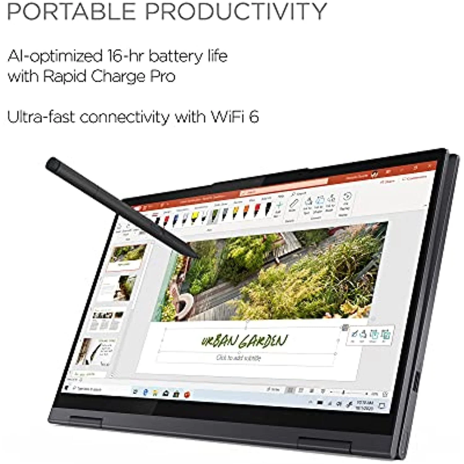 - Crafted from sandblasted anodized metal, the Yoga 7i’s subtly rounded edges are designed to feel comfortable in your hands; and a 360° hinge offers stability as you transition from tablet to laptop mode and back.