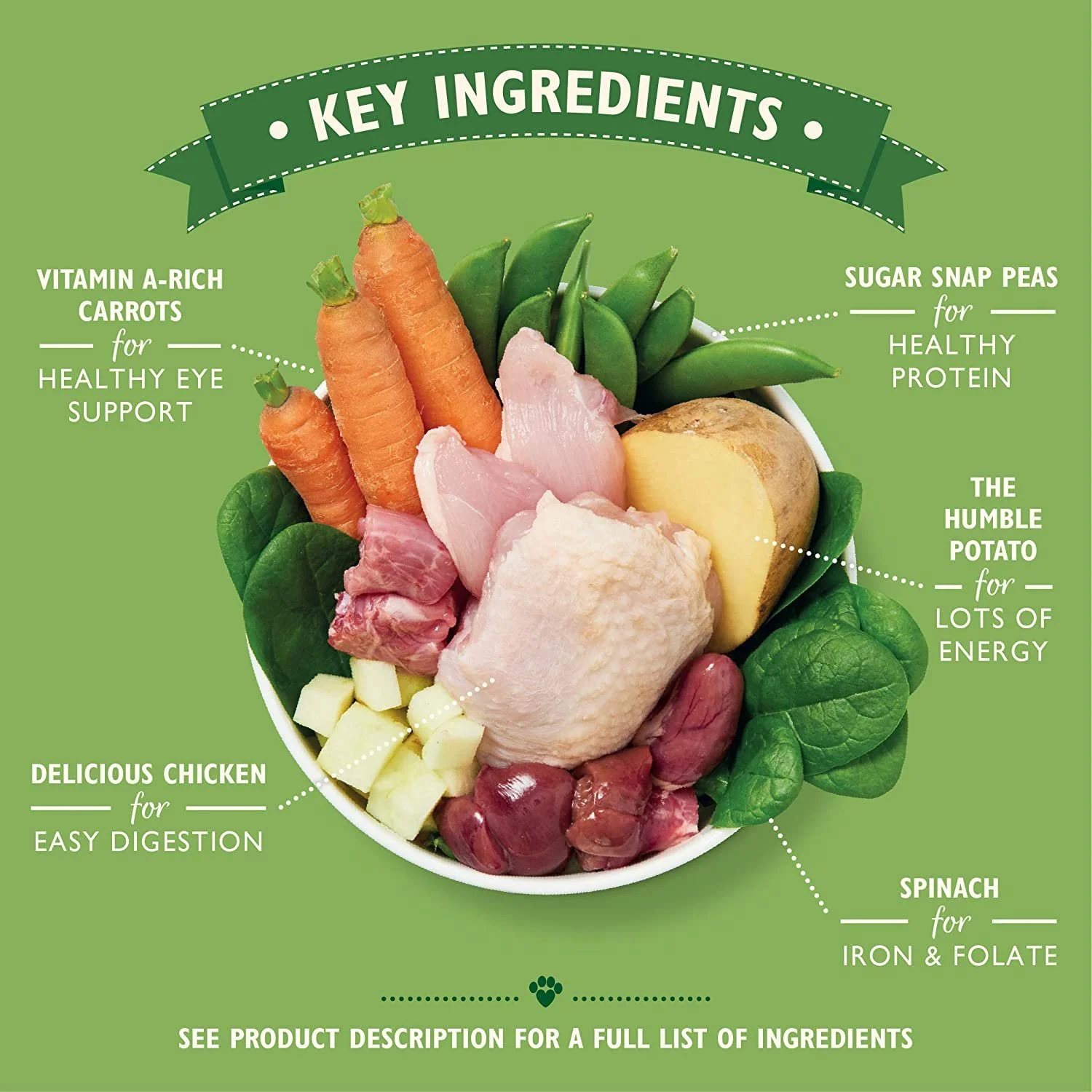| Ingredients | 60% Fresh Chicken, Potatoes (4%), Sugar Snap Peas (2%), Carrots, Spinach (1%), Apples, Vitamins & Chelated Minerals, Safflower Oil (0.1%). Botanicals & Herbs: Golden Rod, Nettle, Aniseed, Celery Seed, Rosehips, Marigold Petals, Cleavers, Seaweed, Alfalfa, Milk Thistle, Dandelion Root, Burdock Root.See more |