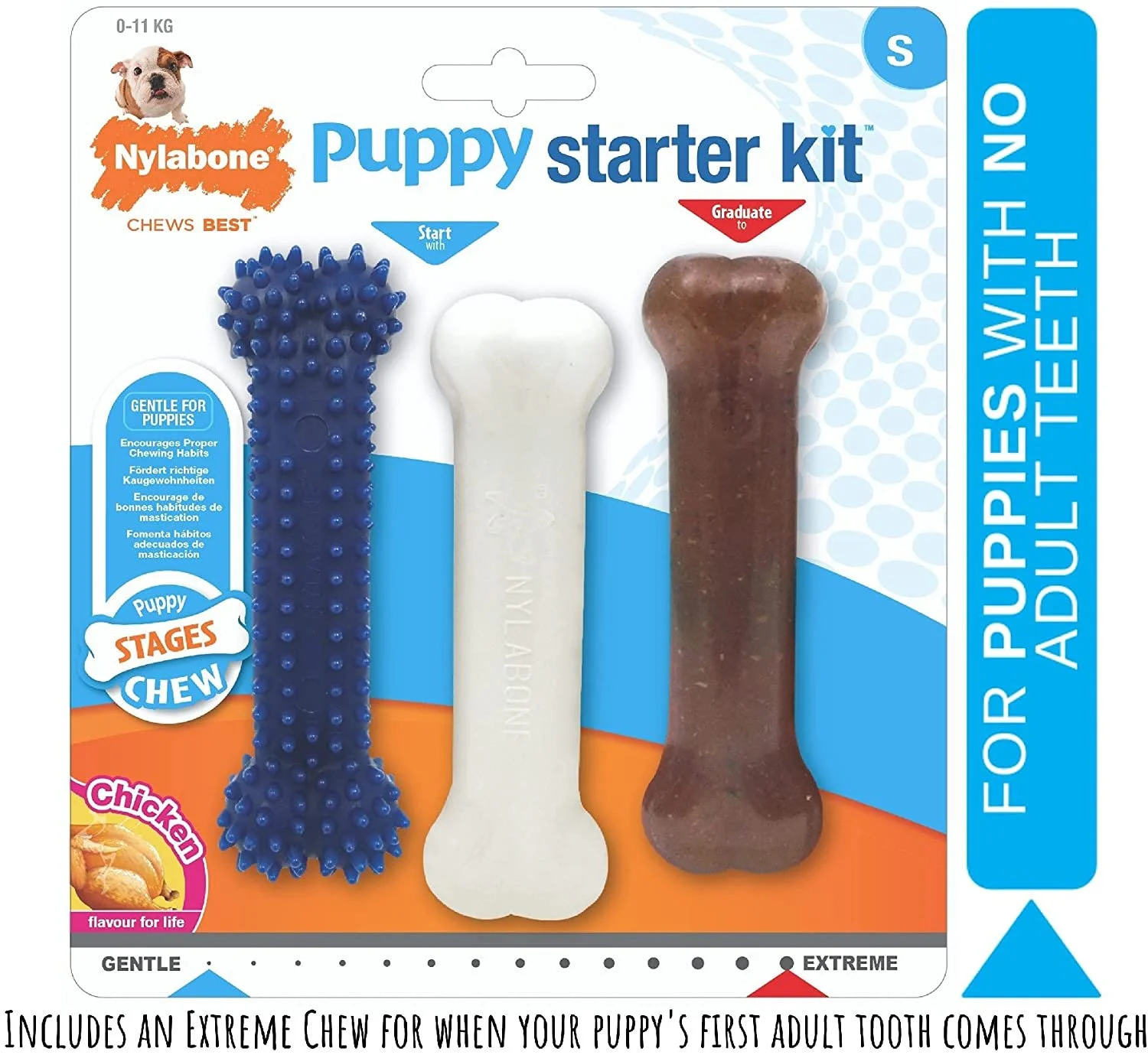Nylabone Puppy Starter Kit, Pack of 3 Dental Dog Chew Bones, Teething, Gentle, Graduate, Small, for Puppies Up to 11 kg £41.60 About this itemThe starter bone (centre of pack) is made with soft, flexible material designed specifically for teething puppies who have not formed any adult teethGraduate to the blue dental bone with nubs once your puppy has some adult teeth. This chew is made of soft, but durable, longlasting non-toxic nylonThe white extreme chew is harder for when your puppy's chewing style develops and he has adult teethGreat for dental hygiene, tiny bristles raise on the bone during chewing, like a mini toothbrush to help keep teeth clean and prevent tartar build upChicken flavour starter pack for puppies up to 11 Kg, progress from gentle to tough. Always supervise the use of any chew or treat›See more product detailsTarget speciesDogBreed recommendationAll Breed SizesBrandNylaboneColourBlue and WhiteMaterialNylon Shop › Nylabone Puppy Starter Kit, Pack of 3 Dental Dog Chew Bones, Teething, Gentle, Graduate, Small, for Puppies Up to 11 kg Purchase Added! About this itemThe starter bone (centre of pack) is made with soft, flexible material designed specifically for teething puppies who have not formed any adult teethGraduate to the blue dental bone with nubs once your puppy has some adult teeth. This chew is made of soft, but durable, longlasting non-toxic nylonThe white extreme chew is harder for when your puppy's chewing style develops and he has adult teethGreat for dental hygiene, tiny bristles raise on the bone during chewing, like a mini toothbrush to help keep teeth clean and prevent tartar build upChicken flavour starter pack for puppies up to 11 Kg, progress from gentle to tough. Always supervise the use of any chew or treat›See more product detailsTarget speciesDogBreed recommendationAll Breed SizesBrandNylaboneColourBlue and WhiteMaterialNylon Reviews Reviewer Name Review Date Star Rating Description Posted on Etsy Product Show More You Might Also Like Ancol Huge Hog No Squeak Plush Dog Toy £57.20 Busy Buddy Hippster M/L, Interactive Treat Dispensing Dog Toy, Chew Toy, Medium Sized and Large Dogs £37.00 Pet Qwerks Babble Ball, Small £48.20 Rosewood Chubleez Chloe Cow Dog Toy, clear £43.60 Rosewood Sonny Monkey Dog Toy £39.20