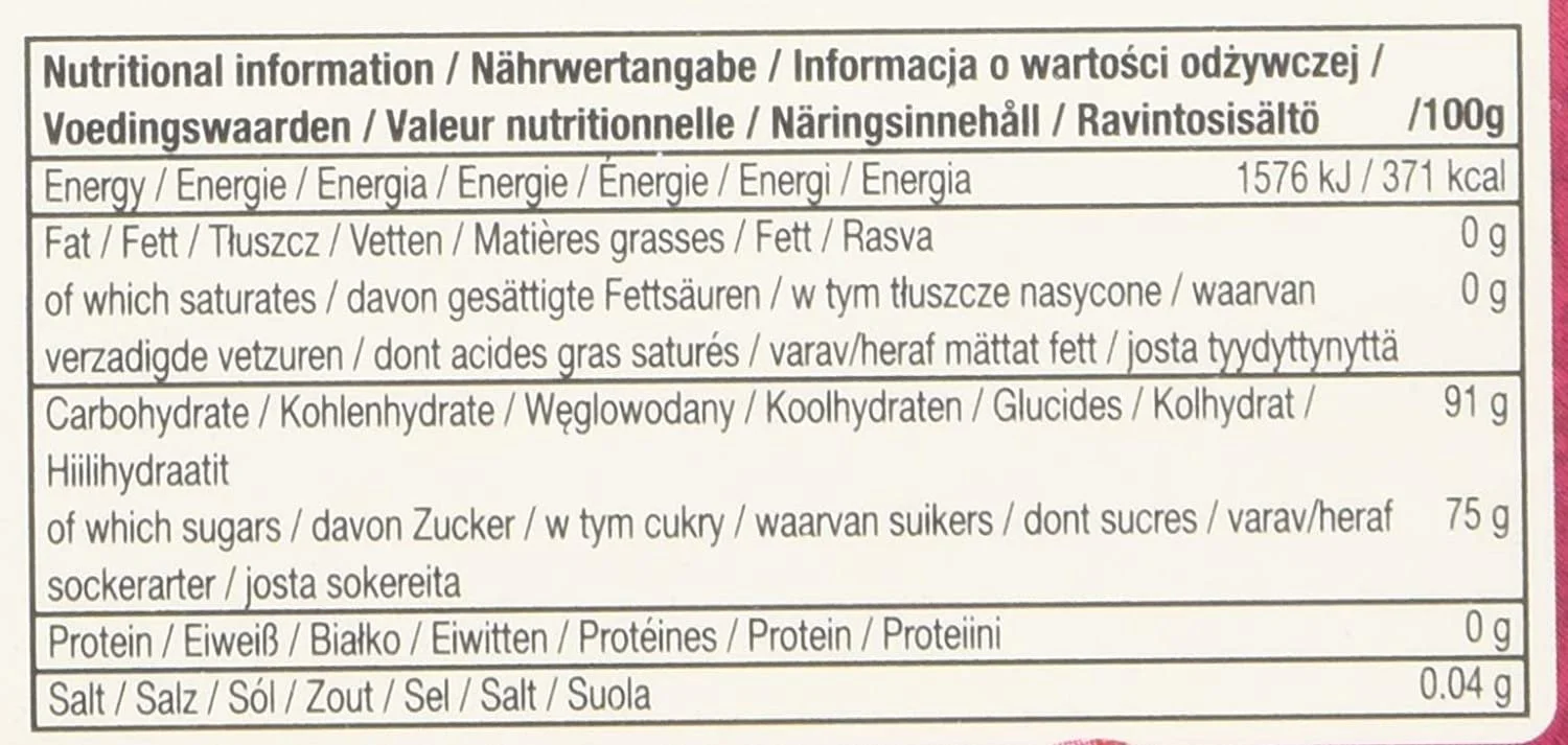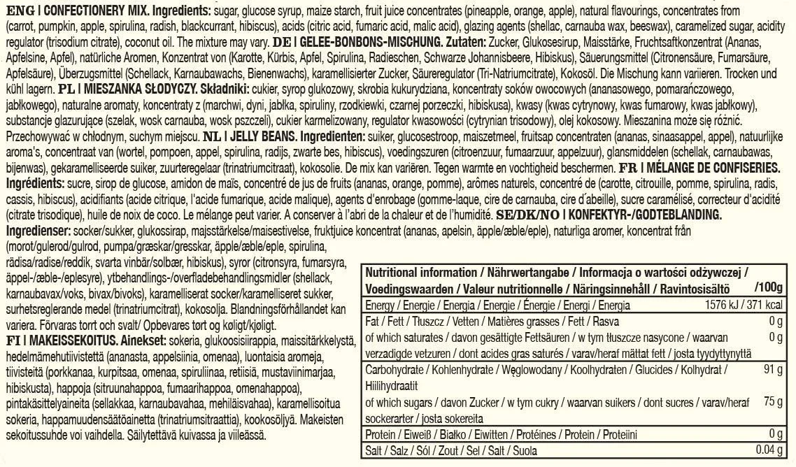 | Ingredients | Sugar, Glucose Syrup, Maize Starch, Water, Fruit Juice from Concentrate (Apple, Orange, Pineapple), Acids: Malic Acid, Citric Acid, Fumaric Acid, Glazing Agents: Shellac, Beeswax, Carnauba Wax, Flavourings, Acidity Regulator: Sodium Citrate, Colours: Turmeric, Copper Complexes of Chlorophyllins, Caramelised Sugar Syrup, Vegetable Carbon, Mixed Carotenes, Lutein, Anthocyanin, Titanium Dioxide, Extract of Spinich and Nettle.See more |