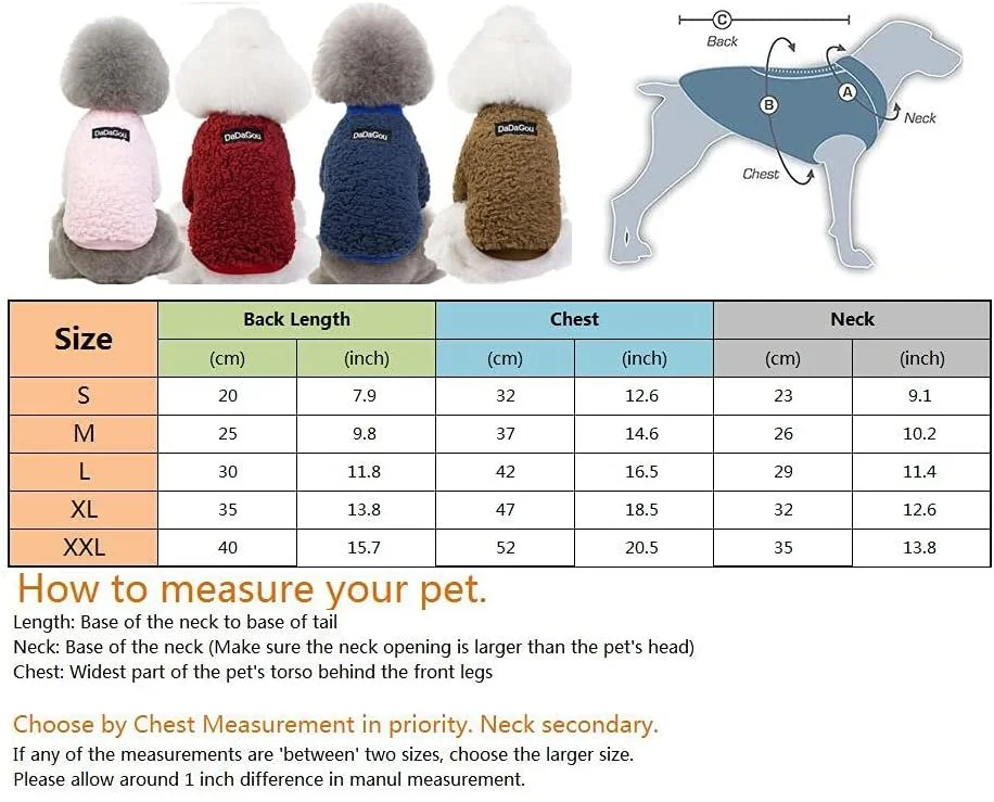 XL - Back Length: 35cm / 13.77in, Chest Girth: 47cm / 18.5in, Neck Girth: 32cm / 12.59in, Fit pet weight: 4.25-6kg / 9.36-13.22LB,Lamb Cashmere Coat Fleece Vest Cold Weather Jacket for Small Medium Pet.