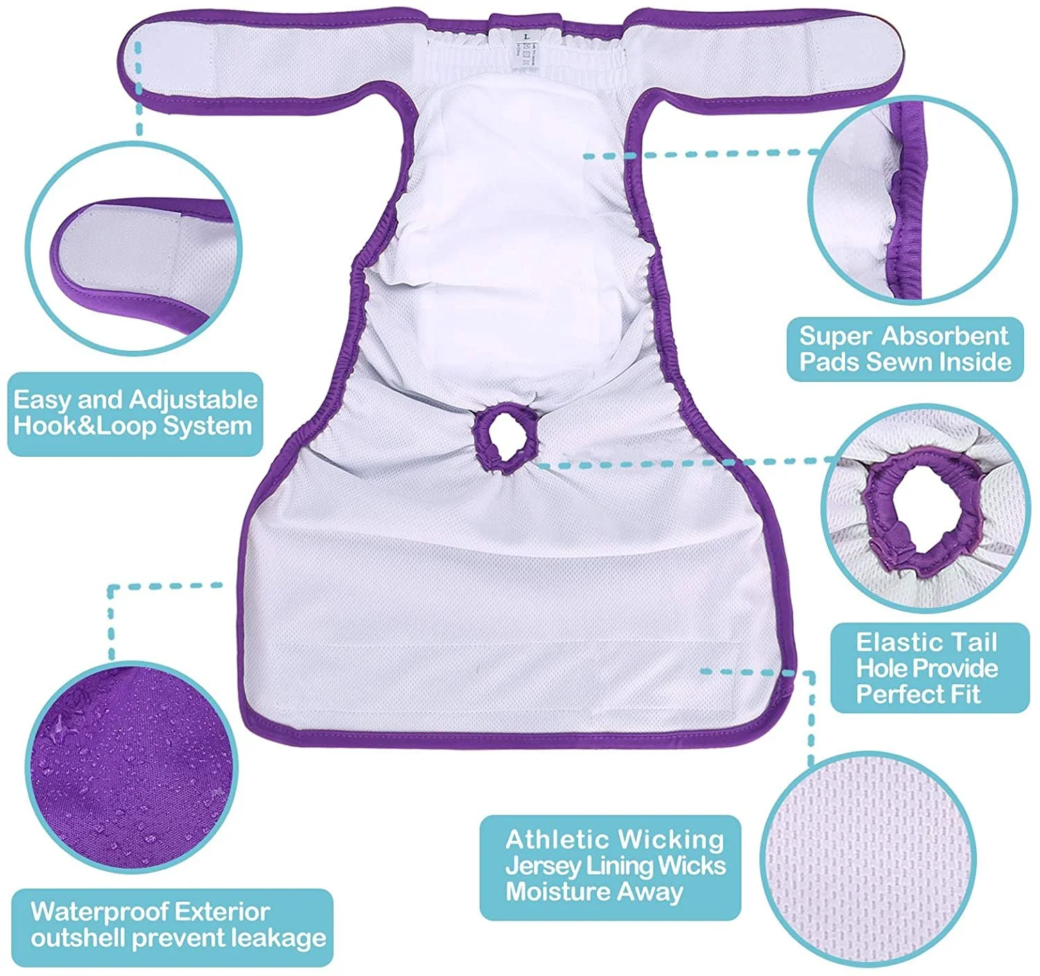 Multiple absorbent polyester mesh inner layers and waterproof outer layer prevent leaks and damages to rugs, carpets, and sofas. Useful for untrained puppies, females in season, and pets that suffer from incontinence