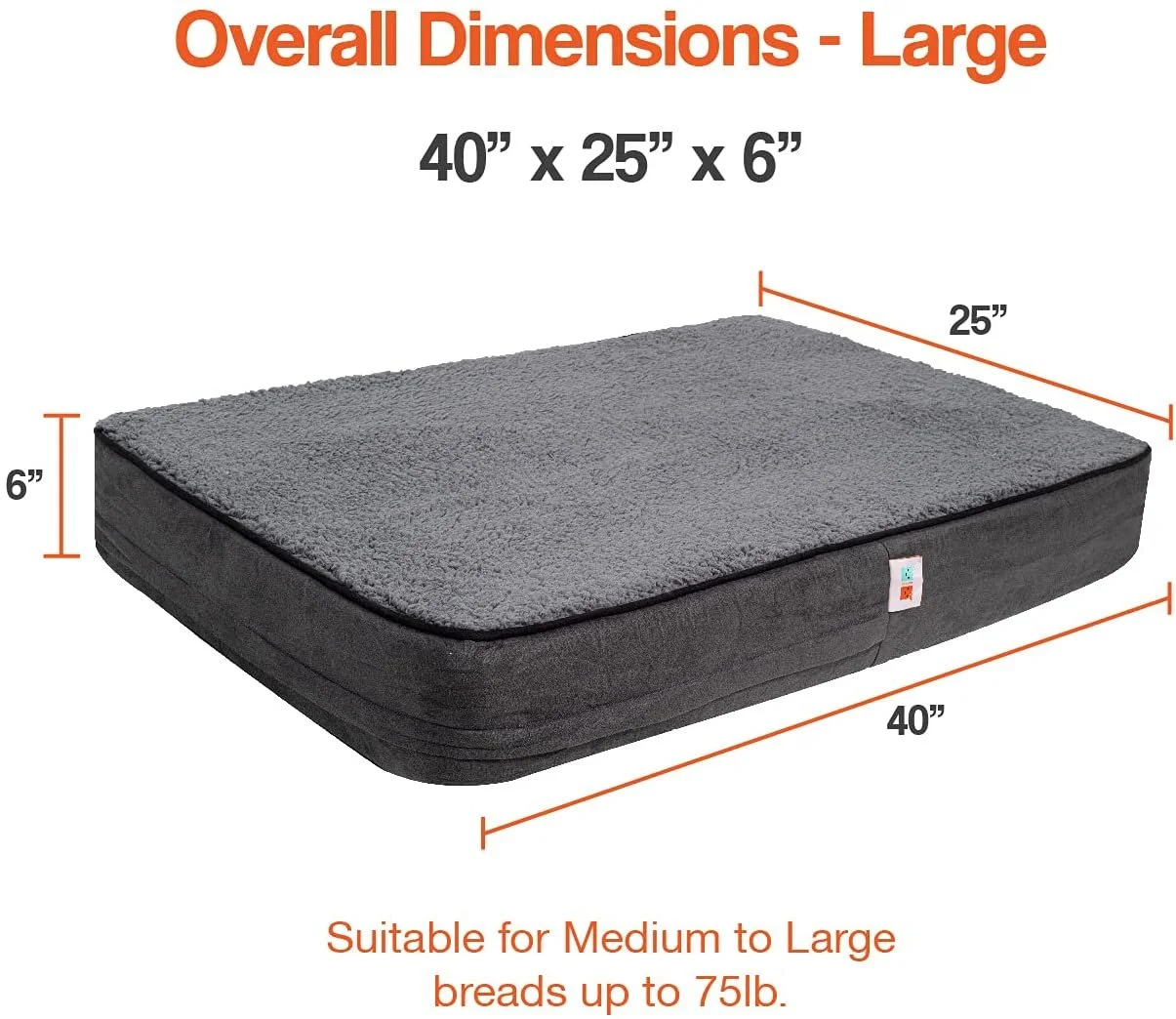 - SIZES: This tough flat mattress comes in two sizes; Medium 34 x 22 x 4 inches, ideal for small to medium breeds and Large 40 x 25 x 6 inches, for medium to large dogs; the size depends on your dog’s sleeping style; does it curl in a ball or spread out? does it share its bed with a sibling or even with the family cat? plenty of room anyway to change position and stay comfy and fits perfect in crates, a bed that any dog can enjoy.