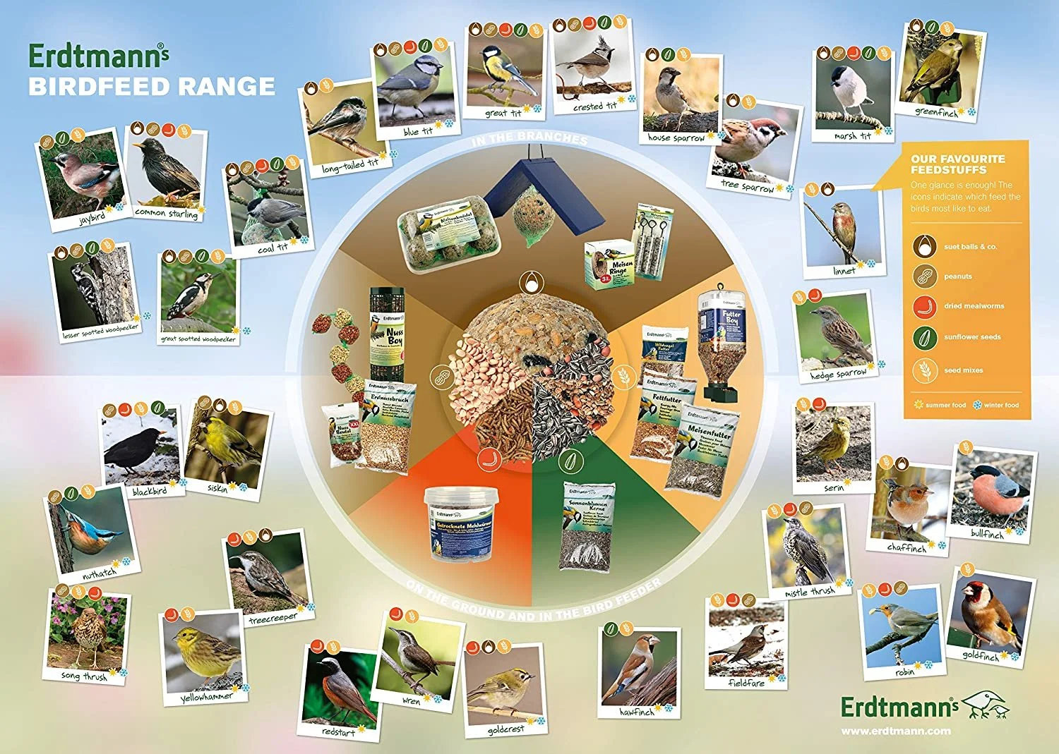 | Ingredients | Peeled sunflower kernels, wheat flakes, oat flakes, wheat, suet, canary seed, turnip rape, peanut kernels, hemp seed, linseed, millet, black sunflower kernels, soy oil, raisins, apples, mountain ash berries, rose hips, elderberries, nigerseed, sorrel, ribwort, hulled buckwheatSee more |