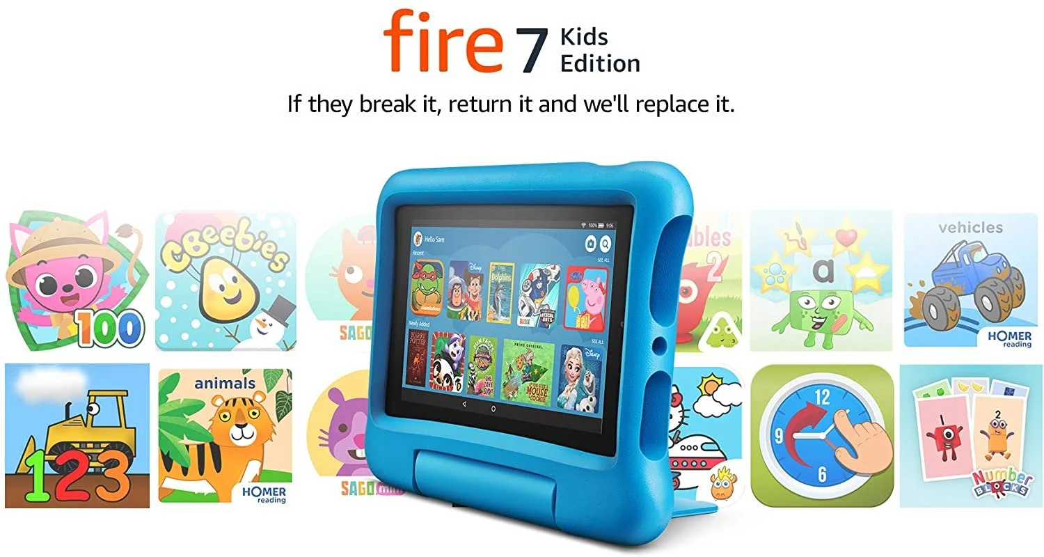 - A full-featured 7" tablet, including a kid-proof case with kick-stand, parental controls, 2-year worry-free guarantee and 1 year of Amazon Kids+ (Fire for Kids Unlimited) with apps, games and videos.