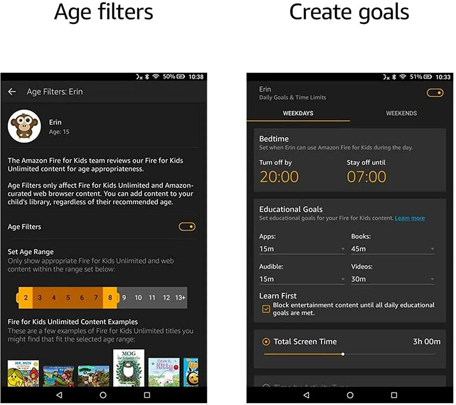 Create screen-time limits and set educational goals remotely from your smartphone using Amazon Parent Dashboard or the Kids tablet.