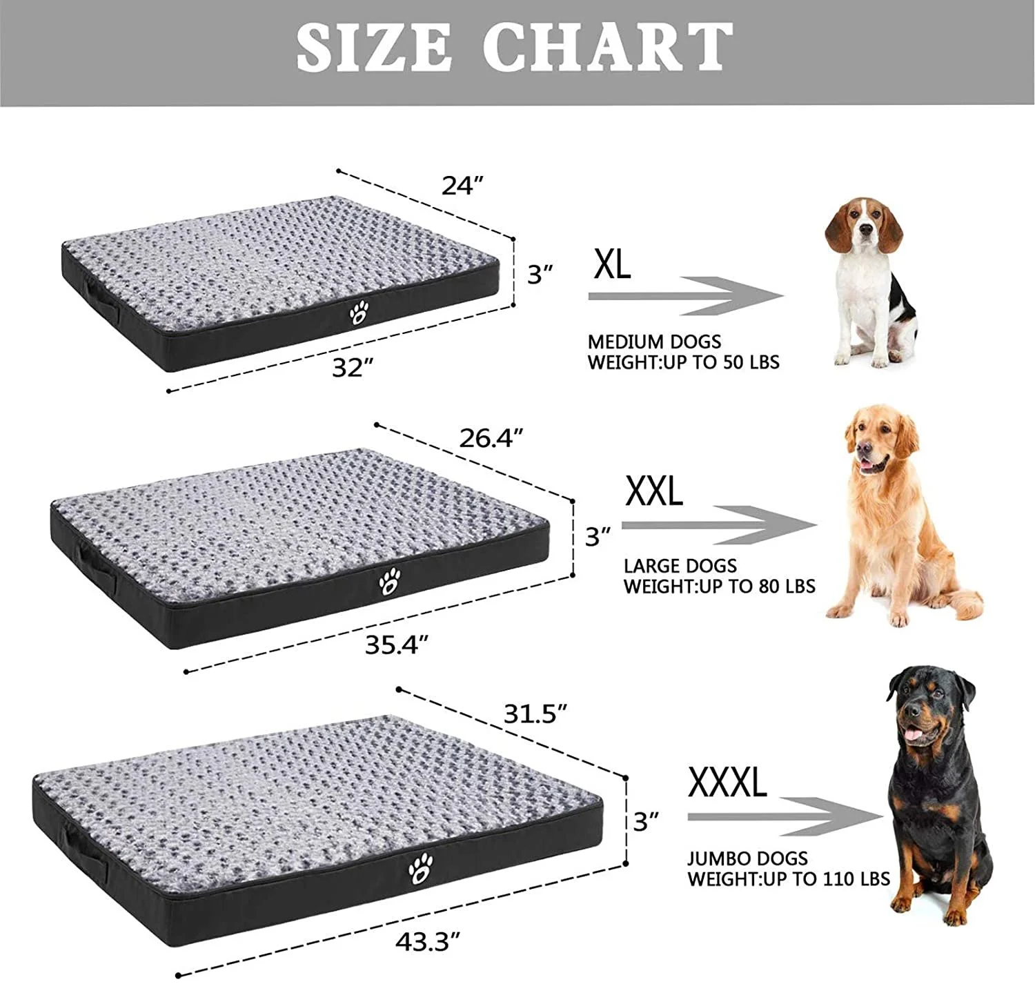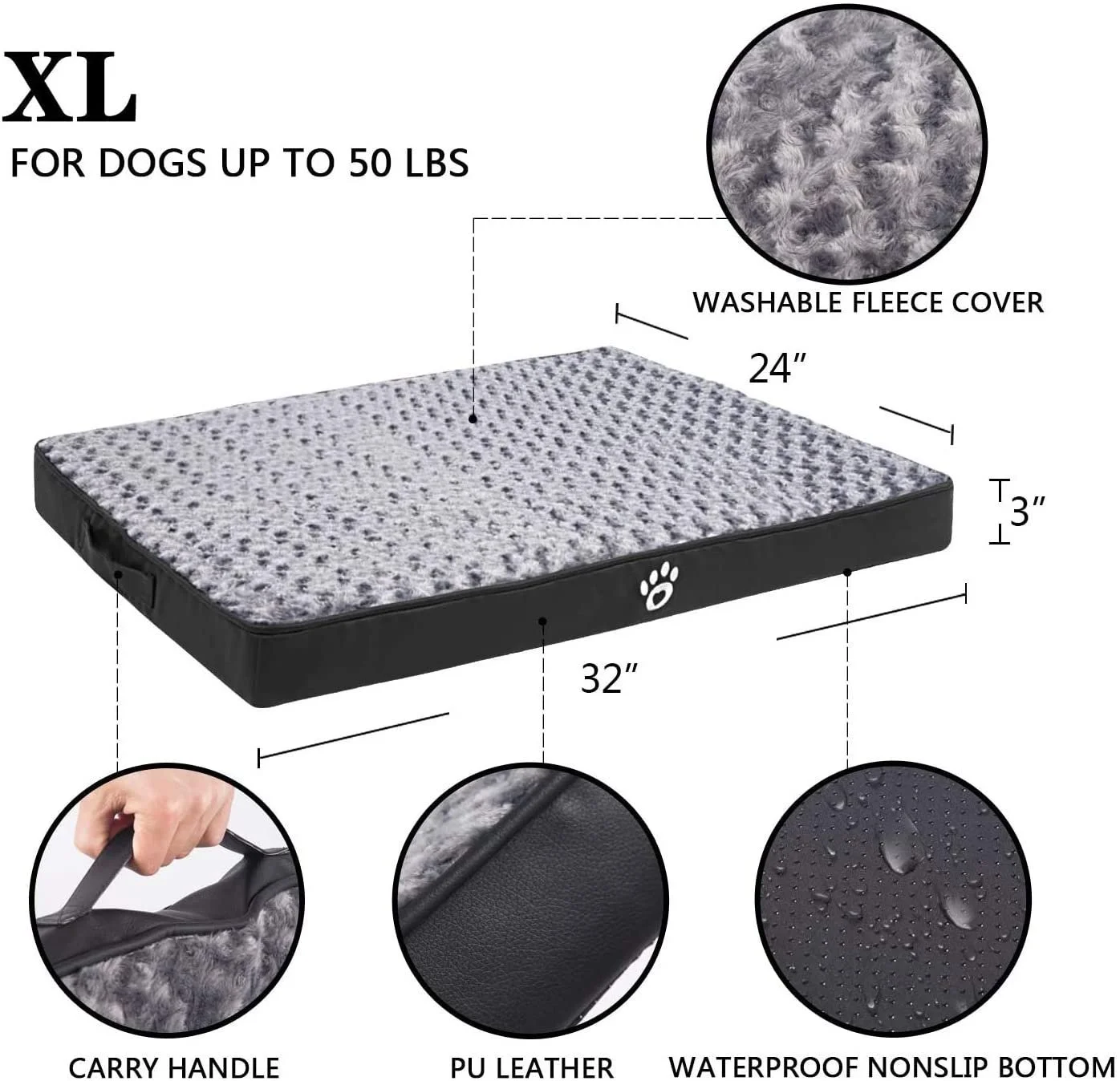 - 【Multiple Sizes and Colors】: XL (32" x 24" x 3"), 2XL (35.4" x 26.4" x 3"), 3XL (43.3" x 31.5" x 3"), for dogs up to 50/80/110 lbs, we provide black, gray, brown, navy blue, wine red to match your home decoration, it is not only suitable for indoors, but also suitable for dog cages,elevated beds and outdoors! The cover is inside the white cushion.