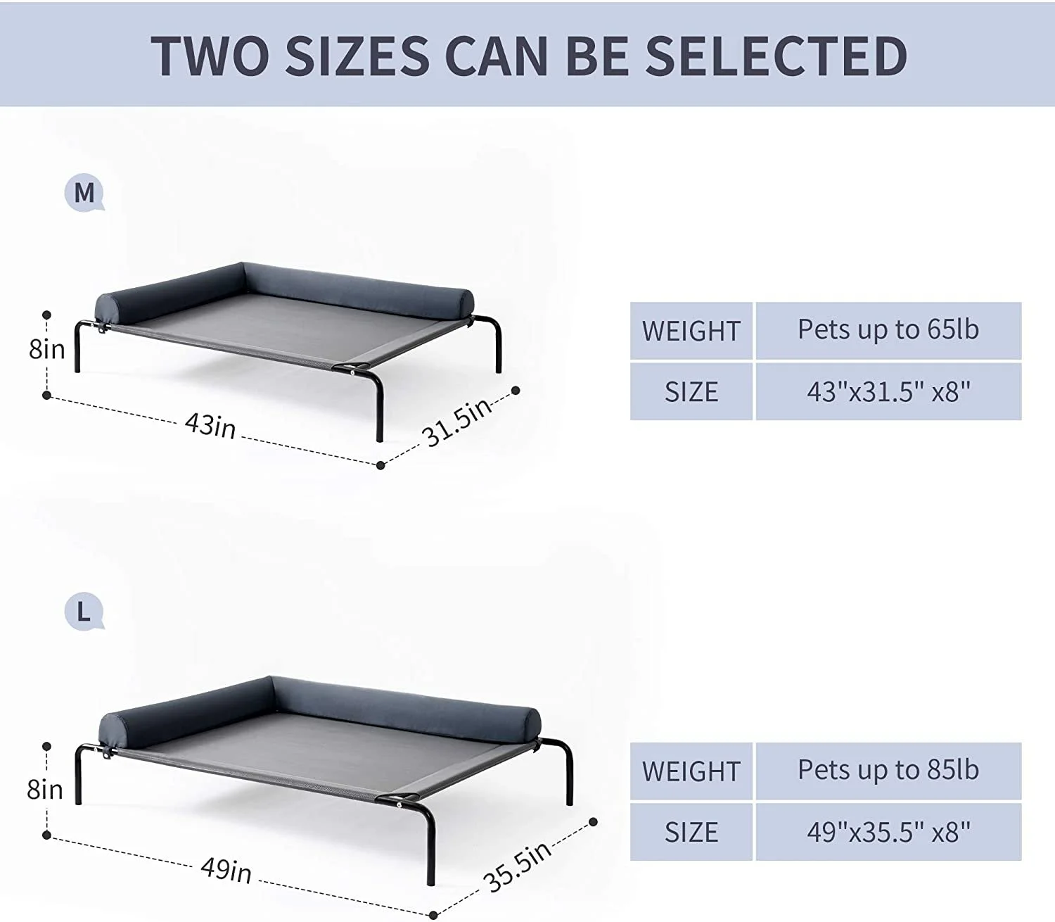 - PERFECT SIZE & CARE: Large Raised Dog Cot: 49"L x 35.5"W x 8"H (Frame), 43"L x 35"W (Mesh), up to 85 lbs. With its strong stability and high-load bearing capacity, the dog cot is ideal for all breeds and ages of dogs and cats (easier for older pets to hop on or off) - Easy to clean: Pet hair, dirt and grime don?t cling to the tight mesh, you can hose the surface (tap water only) or hand wash with mild soap and let air dry.