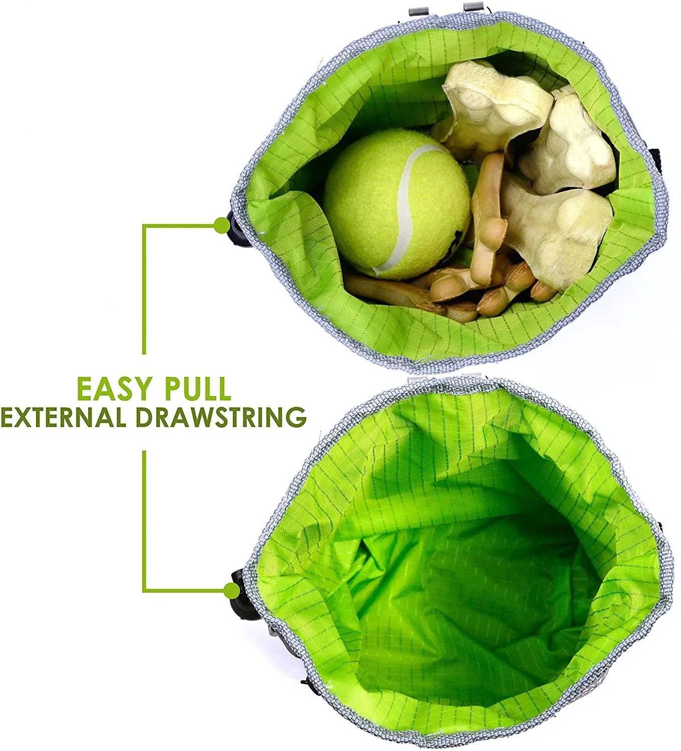 - Easily stores kibble, toys & treats - The convenient drawstring securely holds in generous amounts of dog training treats, accessories, and dog toys. Enjoy the easy to clean bright green lining which makes it simple to spot pet treats right when you need them. Perfect for dog training at the park!