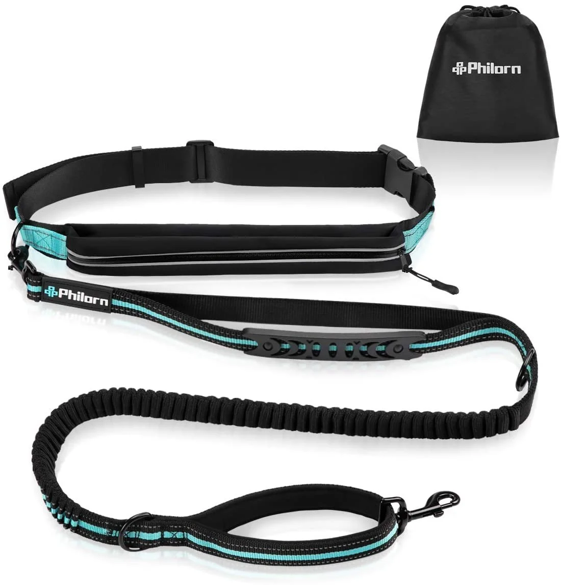 Philorn Hands Free Dog Lead with Phone Pouch, Dog Leash for Running Jogging, Shock Absorbing Dual Handle Bungee(47"-67" Extendable), Reflective Stitching, Adjustable Waist Belt(24"-47"), Endure 150lbs